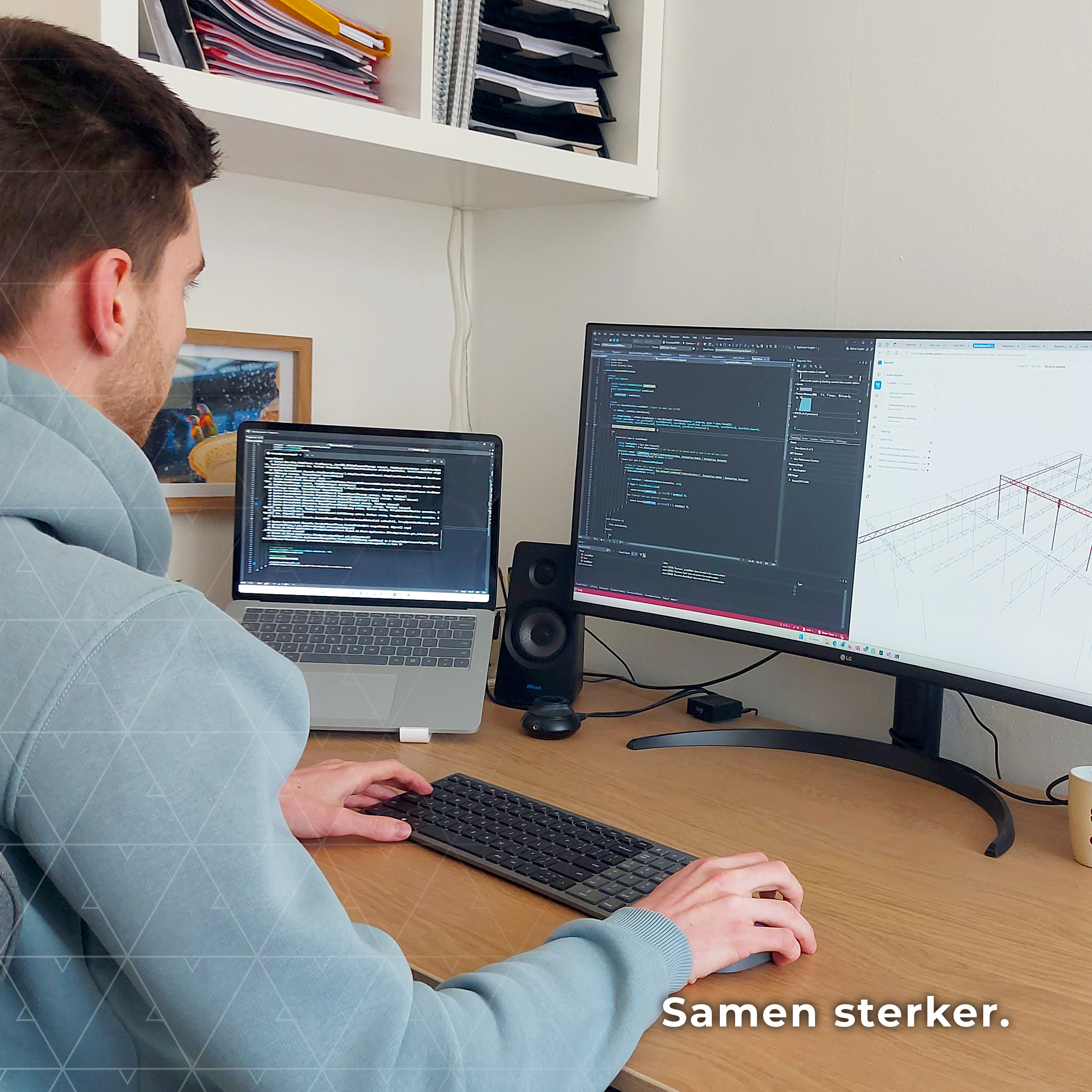 Regelmatig komt Tijn naar kantoor. Daar werkt hij aan slimme tools voor collega’s. “Ik programmeer vooral, denk aan het automatiseren van terugkerende taken waar constructeurs normaal veel tijd aan kwijt zijn.”